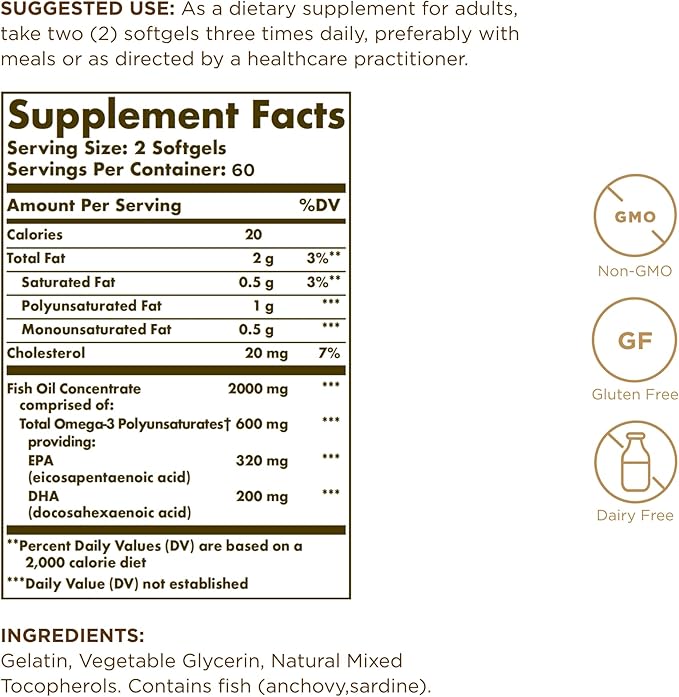 - Fuente natural de grasas buenas; estas cápsulas blandas de concentrado de aceite de pescado Solgar de 2000 mg proporcionan EPA y DHA ricos en omega-3; estos ácidos grasos esenciales no pueden ser producidos por el cuerpo